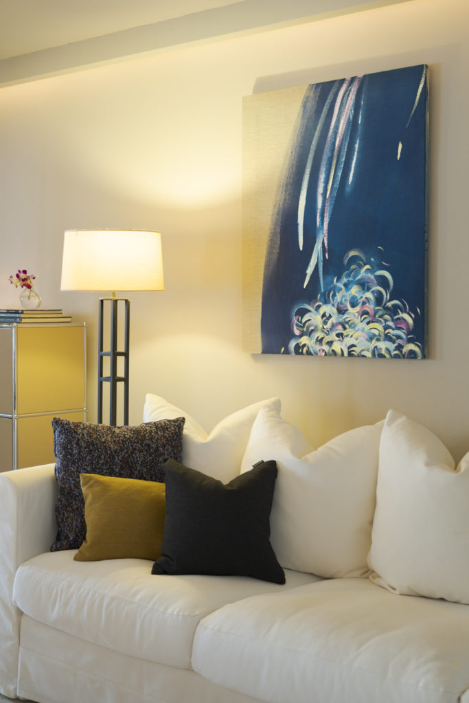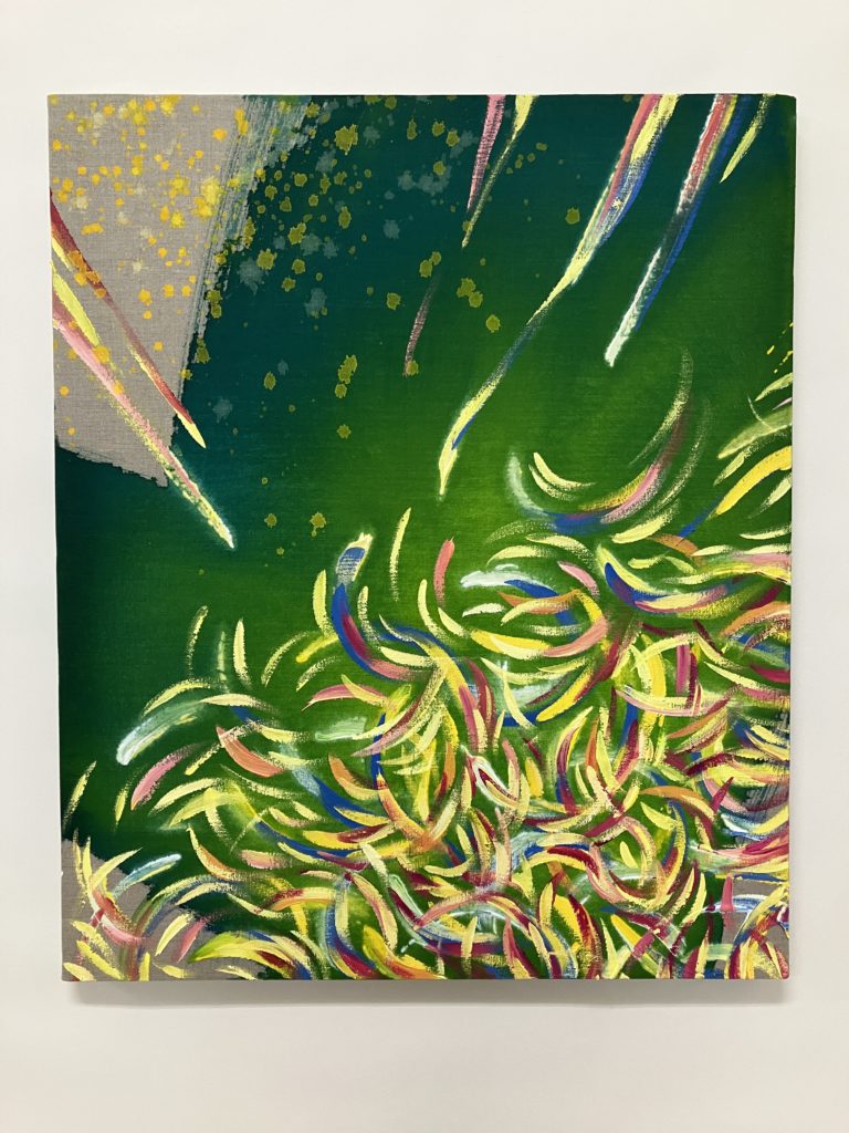 魂の存在というものがあるとすれば、エネルギーがぐるぐる回り響き合う、その動きそのものではないか。その響きを、魂の歌声を描いたシリーズです。「円」や「円の一部としての曲線」は、巡り回って循環していく形。下地を塗らない亜麻をキャンバスに用い、布地そのものの面は現実空間を表し、滲んだ背景や広がりをもつ色面は、空でも宇宙でもこの世でもない、無形のエネルギーの広がりを表しています。その境界の中で色とりどりに輝く、魂の響きが躍動します。
