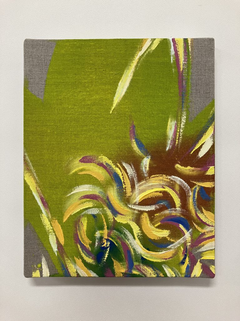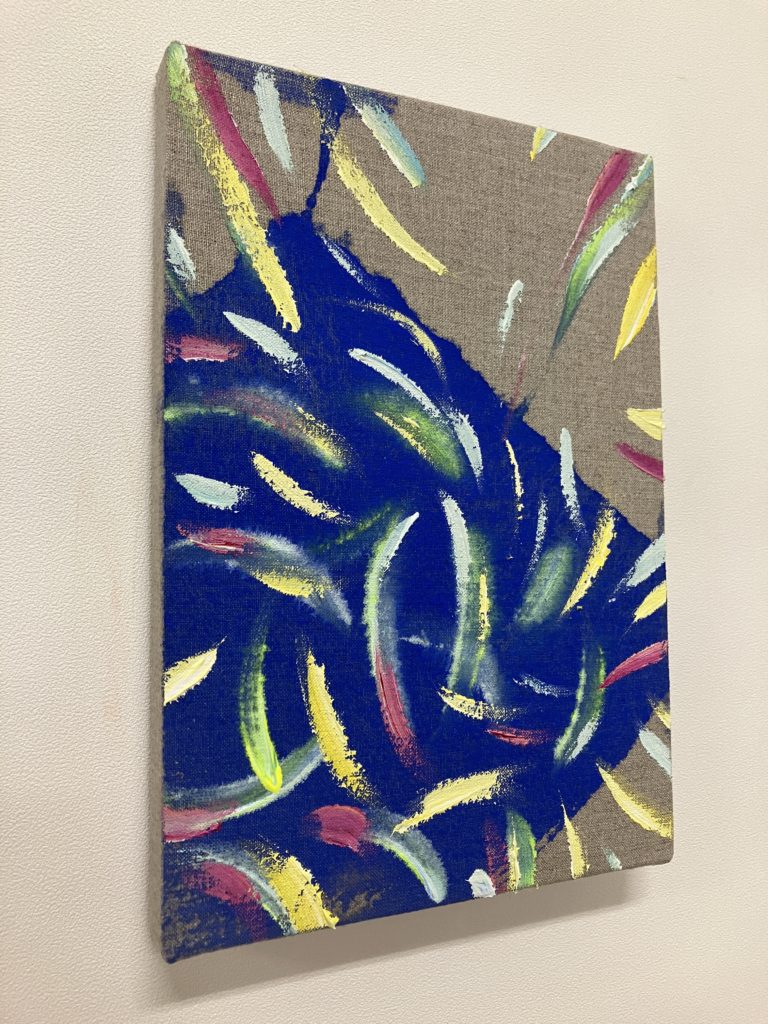 If souls did exist, it must indicate the movement of energy whirling around and echoing against each other. This series captured that echo—the singing voice of the soul— onto the canvas. The circles and the curves that are a part of a circle demonstrate the movement of going around and circulating. Using ungrounded flax as the canvas, the fabric surface is a materialization of reality. The blurred background and the spreading hues depict formless energy that is neither sky nor space, nothing of this world. The soul echoes dynamically in that boundary, while twinkling in many colors.